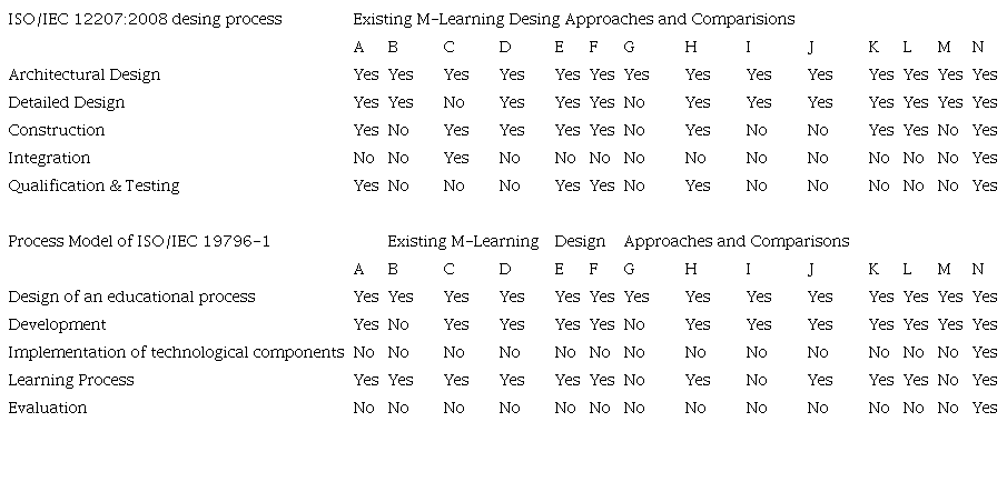 The existing design approaches for M-Learning pedagogy and software application from Table 2 (coded as A, B, C, D, E, F, G, H, I, J, K, L, M and the newly proposed approach is coded as N) is compared with ISO/IEC 12207:2008 and ISO/IEC 19796-1 standards. These comparisons are shown in the Table 3 and Figure 3. Out of seven process groups in ISO/IEC 12207:2008 standard five have been taken for comparisons. The comparison with ISO/IEC 19796-1 covers five processes out of seven. ISO/IEC 19796-1 is a standard that help educational organizations to develop quality systems and improve the quality of their processes, producís, and services (Pawlowski, 2007).