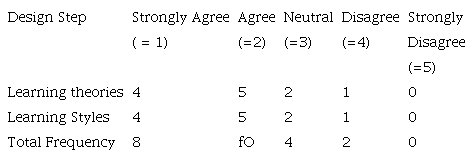 The experts have positive perception towards stakeholders' identifications, requirements classification and modeling before actual design starts. Eight of them view it's important to go for parallel design and development of learning content and software while two of them disagree. When the reasons for their disagreement were investigated it's found that the disagreement is due to less experience in M-Learning. The experts have positive opinión for including the learning styles and learning theories during instructional and learning design as shown in Table 4. This further supports the pedagogical design steps in the proposed model.