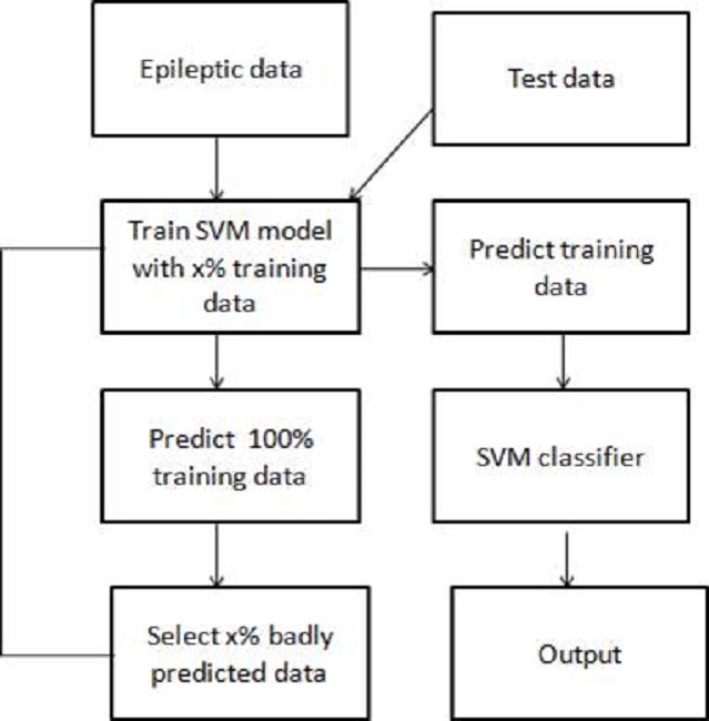This algorithm helps us predict the results of epileptic patients in an efficient way. The training and testing is fed into the model. The SVM model checks for x% percent of training dataset and if they are badly predicted they are again fed into the model for training and the test data are compared with the training dataset to predict the output. The Architecture is shown in Fig. 1.