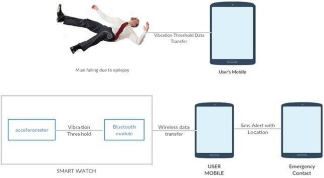 The system uses Support Vector Machine algorithm to predict whether the person is suffering from epilepsy and helps to classify different type seizure the patient undergoes. The GUI is developed to create user friendly advantage for the patients even assists in the absence of doctors to get accurate test results. The system consists of a android application and a smart watch along with inbuilt accelerometer and Bluetooth module. The mobile application is already fed with different vibration levels that happen in human body. The smart watch is worn by the person and it monitors the vibration level that occur in human body and send it to mobile application to predict epilepsy. The maximum threshold vibration is calculated and compared with the pre-existing data in mobile application using Support Vector Machine (SVM) algorithm. If the threshold doesn’t match with the pre-existing data then the system generated the location of the person and sends an alert message along with location to the emergency contact