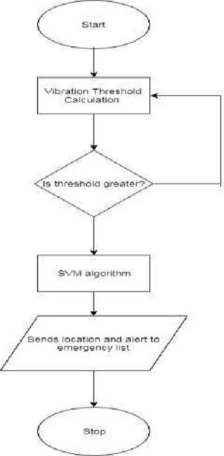 Threshold levels of various vibrations that occur in the body are taken and fed in to the mobile application. A wearable device consisting of accelerometer sensor is used along with this mobile application to calculate the threshold generated due to the vibration created in the body by seizure. Both the mobile application and the wearable device are always connected via Bluetooth or Wi-Fi. When there is a vibration in the body the accelerometer sensor senses the vibration and calculates the threshold generated for that vibration. And the collected threshold data is then sent to the mobile application for initial level of checking. When the threshold crosses the minimum level vibration of body then the threshold data is used to calculate the differences of that particular threshold value and the preexisting threshold data which is already fed in the application. For the better analysis, the data is stored in the cloud for the future retrieval. We use Support vector machine technique to identify the difference for the generated threshold and the pre-existing threshold value. The data is preprocessed and normalization is performed for better results. Using this algorith we can henceforth predict the seizure activity in the body and the alerts for the emergency contacts are sent. When the application detects seizure in body is takes the present latitude and longitude values of the mobile and sends it along message to the emergency numbers. The mobile application is also featured to track the current location of the victim's mobile which helps the caretaker to easily locate the victim. The flow of the system is shown in Fig. 2. Implementation flow is shown in Fig. 3.