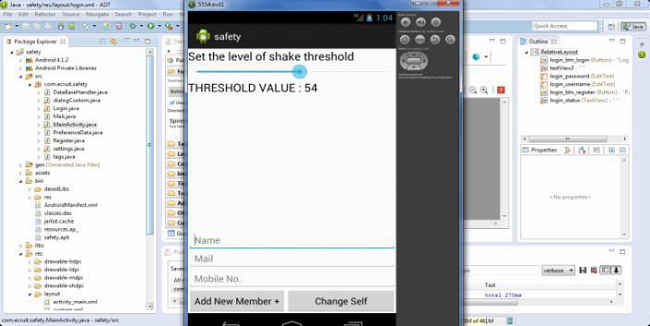 As mentioned, the user login page is used to login to the application. The emergency contacts add page has three parameters namely the contact's name, mail and phone number. The mail address and the phone number are used to send the alert messages. After adding the contact details are stored in the application for future use and the application displays the name of the contact that are stored. The threshold page has a default threshold value setup which acts as a basic threshold to calculate the received threshold value. The wearable device has accelerometer which helps in generating threshold value for the vibrations that are created in the body. The generated threshold value is transferred to the application via Bluetooth or Wi-Fi. The transferred threshold is calculated with the given basic threshold value. When the comparison does not match then the transferred data is classified with the fed in threshold data using support vector machine algorithm. The algorithm classifies the continuously generating threshold and predicts the occurrence of seizure in the body. After predicting the geographical status of the mobile is taken by the application. The generated geographical status is then shared with the emergency contacts which is stored in the application. This data is sent along with an emergency message to the receiver. The application also creates an alarm to alert the public about the incident. From the next minute of sending the alert message, the victim’s mobile location is turned on which enables the receiver to track the victim’s location. The result is shown in Fig. 4.