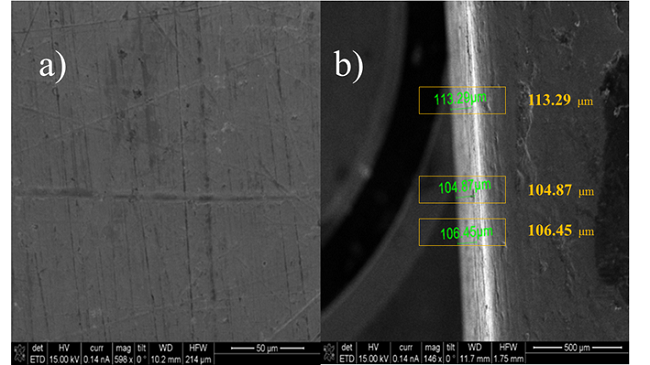 Figure 6a shows SEM micrographs of the alumina surface layer deposited by DLI-MOCVD at 370 °C and a deposition time of 90 min. It can be observed that the layer of Al2O3 is quite homogeneous. Scratches of the polishing process on AISI 1018 steel can be observed, however superficial defects such as pitting, lifting, loss of brilliance, poor adhesion or stains with metallic finishes are not noticed, which confirm the efficient deposition on Al2O3. The thickness of the layer (Fig. 6b) was measured giving approximate values of 100 μm.