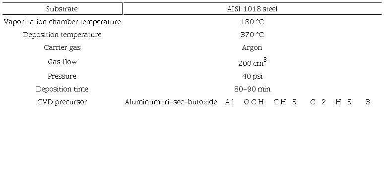 There exist physical and chemical deposition techniques for manufacturing films and coatings of different nanostructured materials. Among the chemical processes, one of the most used is the chemical vapor deposition (CVD) (Martin, 2010; Ohring, 2002). In this technique a chemical reaction of a mixture of gases or chemical vapors is carried out to obtain a solid product in form of thin film or coating deposited on substrate. Currently, variants of the technique are being developed and improved. For example, direct liquid injection metal organic chemical vapor deposition (DLI-MOCVD), allows the formation of epitaxial crystalline layers at low temperature (Serrano, Serrano, Juárez, & Juárez, 2016). With the automatic control of this technique is possible to achieve a constant vapor flow into the heating chamber, which favors the homogeneous growth rate of the layers (Mun et al., 2016; Serrano, Martínez, Juárez, Serrano, & Juárez, 2017). AISI 1018 steel is widely used in industry, although it is commonly protected to increment its time-life. The present research shows the advantage of using an electromechanical injector in the vaporization chamber and allows the precursor to transform into amorphous Al2O3 in order to produce a layer of this material on the AISI 1018 steel substrate. The flow of atomized solution is controlled by an electromechanical injector which controls consumption the precursor provided in vapor phase to the chamber.