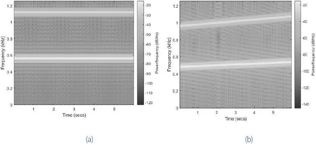 A first experimental work was accomplished by using simulation signals. Such signals were based on the vibration model expressed by equation (1). Two simulation signals were programmed: (1) a signal (S1) simulating the vibration produced by a 16 tooth gear, rotation speed equal to 30 Hz (thus, the meshing frequency is equal to 480 Hz) and modulation index equal to 0.4; and (2) a signal (S2) with the same characteristics, except by the rotation speed that is variable, leading the gear-mesh frequency to span linearly between 480 Hz to 536 Hz. The signals were sampled at 2.5 kHz. Spectrograms of both signals can be shown in figure 1, where the second harmonic of the meshing frequency can be also shown.