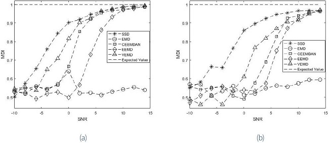 The monocomponent signal decomposition techniques under test, EMD, EEMD, VMD, SSD and CEEMDAN, were applied on simulation signals S1 and S2. For each realization of noisy signal and each group of monocomponent signals delivered by the decomposition techniques, the monocomponent signal that corresponds to the first (or second) harmonic of the vibration produced by the gear was selected by means of the MDI computation: the monocomponent signal with higher MDI was the selected one. Since 50 realizations of noisy signals were generated per SNR, the average of the selected 50 MDI values, per technique, was computed. The results can be shown in figures 2a and 2b.