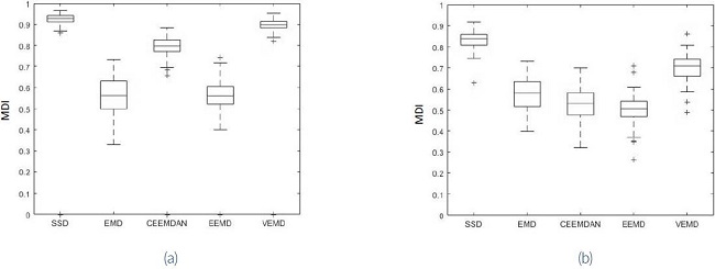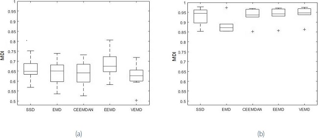 The monocomponent signal decomposition techniques were applied on signals gathered from the wind turbines. For each signal, each monocomponent signal decomposition technique delivered a group of monocomponent signals, from which the monocomponent signal corresponding to the first (or second) harmonic of the vibration produced by the gear was selected (the monocomponent signal that yielded the highest MDI). The boxplot of the highest values of MDI, achieved by each monocomponent signal decomposition technique, in case of signals registered from both the healthy and the faulty wind turbines are shown in figure 5a and 5b, respectively.