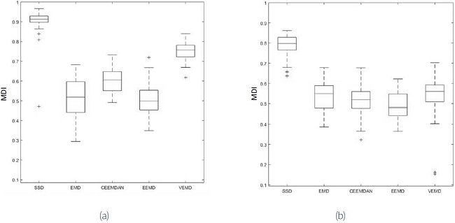Boxplot of MDI values, for each monocomponent signal decomposition technique, simulation signal S1, and SNR = 2 dB and SNR = - 2 dB, can be shown in figures 3a and 3b, respectively. On each box of every boxplot of this research, the central mark indicates the median, and the bottom and top edges of the box indicate the 25th and 75th percentiles, respectively. The whiskers extend to the most extreme data points not considered outliers, and the outliers are plotted individually using the“+” symbol. Figure 3 clearer reveals which techniques deliver with higher quality the modulation signal and which techniques degrade less the performance as the SNR reduces. In general, the technique SSD exhibits a better performance.