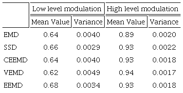 Figure 5 reveals how the modulation quality is improved when the gear is damaged. With regard to the question of which technique performs in a more suitable form, this figure shows that almost all techniques exhibit similar results. In table 1, statistical quantities of the achieved MDI are presented. It can be observed that in case of the low-level modulation, the best outcomes are achieved by the techniques EEMD and SSD (higher mean values and lower variances). In case of the high level modulation, the results achieved by the techniques were very similar, except by technique EMD, which exhibited the worst results.