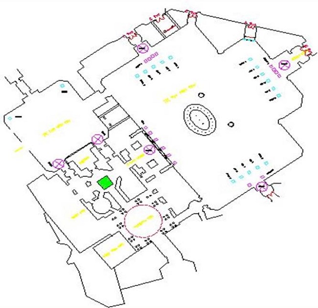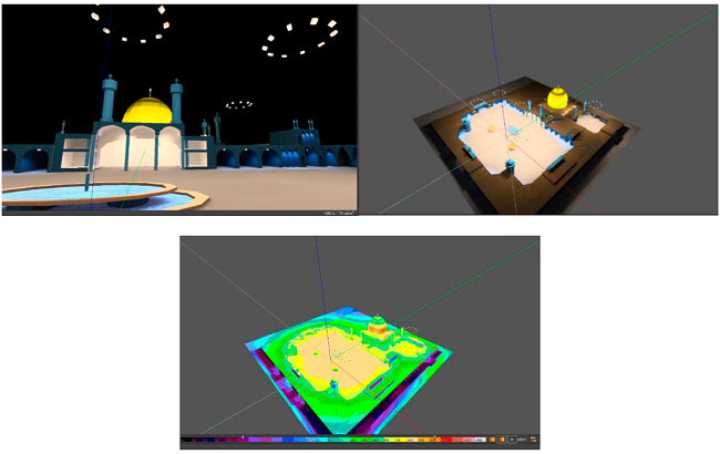 In order to simulate the current lighting scheme of the Holy Shrine of MASOUMEH and provide detailed examination, and present novel alternative schemes, the architectural information including dimensions, size, height, and structure of Holy Shrine of MASOUMEH, have been calculated according to the imaging in field study, and then simulated by DIALux Evo software.