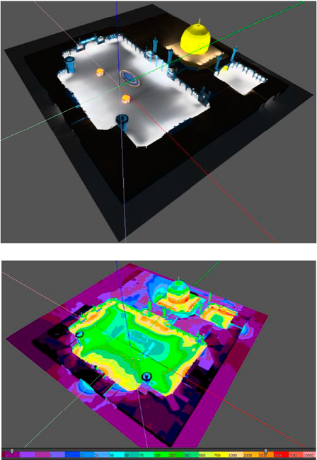 Simulation results of proposed alternative schemes, including 3D image and False Color curve provided by DIALux Evo software, are presented in Fig. 5. The results confirm the improvement in technical conditions of lighting in the proposed scheme compared to those of the current scheme. These conditions include providing minimum illumination at all points in the courtyard, avoiding dazzling lighting, and uniformly distributing the light in the second alternative scheme. In addition, in the current lighting scheme of the courtyard, about 60 percent of the courtyard area has the intensity of light less than 20 lux, which is against the standards for such an area. However, in the proposed alternative scheme, an average intensity of 50 lux is provided with six lighting towers that meet international standards. These conditions include providing minimum illumination at all points in the courtyard, avoiding dazzling lighting, and uniformly distributing the light.