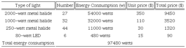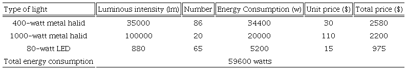 In the proposed alternative scheme, the distance between towers is used to satisfy the most intense lighting at all points of the courtyard. According to international standards for such area, lighting intensity varies in the range of 20 to 50 lux. In Holy Shrine of MASOUMEH’s courtyard, because of religious ceremonies and the need for good lighting to study holy books, such as Quran etc, sufficient intensity of light should be adjusted according to the standards. To this end, in our second alternative scheme, the intensity of lighting is set to 30-75 lux at all points of the courtyard. The number of projectors and the amount of energy consumption along with the associated price used in the proposed scheme for the lighting of the courtyard are presented in Table 2.