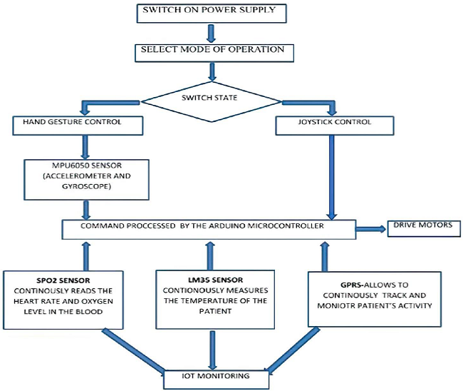 The flow chart in Fig.3. depicts the working process of the system. Once the power supply is switched on, the patient can either operate the wheelchair with the joystick or by using hand gesture.