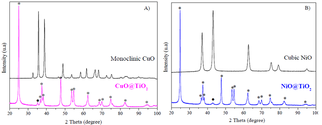 X-ray diffraction patterns of the CuO@TiO2 and NiO@TiO2 core-shell samples corresponded to predominated anatase phase; however, a small amount of CuO peak at 35.4° (0 0 2) and NiO peak at 43.3° (2 0 0) were also detectable. In both XRD patterns, the peaks at 2θ = 25.3°, 36.6°, 37.8°, 38.6°, 48.0°, 53.9°, 55.1°, 62.7°, 68.8°, 70.3°, 74.1°, 82.2° and 94.2°, are indexed as anatase TiO2 (21-1272 JCPDS card). The anatase TiO2 crystallite size calculated from the most intense diffraction peak (1 0 1) at 25.3° is 41.2 nm for NiO@TiO2 and 44.8 nm for CuO@TiO2, Table 1.