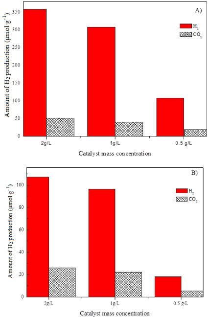 In order to study the effect of photocatalyst concentration in the reaction mixture on the catalytic activity, the hydrogen production rates were measured by varying the catalyst mass, shown in Fig. 10. As the photocatalyst concentration increased from 0.5 to 1 g/L (one gram of catalyst per liter of reaction mixture), the photocatalytic hydrogen production rate was increased by almost 3 times; however, when the catalyst concentration in the suspension further increased from 1 to 2 g/L, hydrogen production rate was increased by only 15~18 %. This is probably related to the effects of light absorption and scattering. When the photocatalyst concentration was relatively high, the solar light was not able to completely penetrate the suspended mixture due to scattering influence by the suspended solid particles. Therefore, the photocatalytic H2 production rate was not proportional to catalyst mass. Too big amount of the catalyst mass may not benefit the increment of photocatalytic H2 production. In the present experiment, we did not further test the effect of catalyst mass greater than 3g/L.