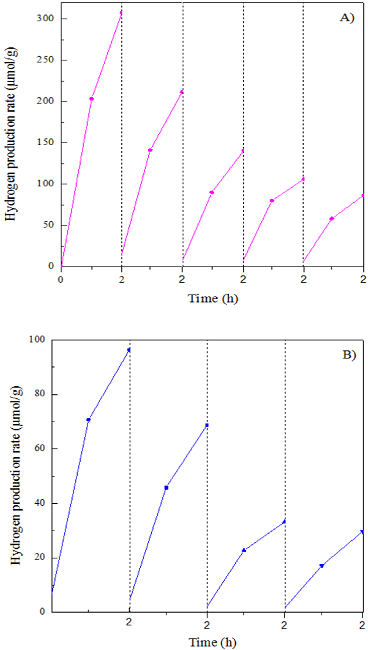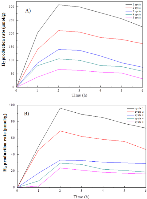 The photocatalytic stability of the two better CuO@TiO2 and NiO@TiO2 catalysts was measured in five catalytic runs and each recycling took for 6 h of reaction. The H2 production rate results are plotted Fig. 11. In both catalysts, the rH2 value gradually decreased with the increase of the number of reaction cycle. For each cycle, the rH2 value increased in the first two hours of reaction, and then it gradually reduced. For the best catalyst CuO@TiO2, after total 30 h of reaction of 5 runs, the rH2 value diminished to approximately 25 μmol g−1.