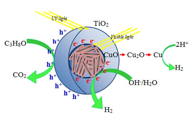 From the semiconductor heterojunction point of view, a heterojunction structure may be formed in the interface of TiO2 shell and CuO core of the CuO@TiO2 catalyst (Wang et al., 2014). When the catalyst was initiated by photons with energy higher than or equal to the band gaps, the photo-initiated electron-hole pairs can be quickly separated: the electrons in the conduct band (CB) of TiO2 in shell may automatically flow to the CB band of CuO core under the effect of the electronic field in the heterojunction irradiated by solar light because the conduction band of CuO (0.96 eV) lies lower than that of TiO2 (−0.45 eV) (Lei et al., 2016; Xu & Sun, 2009); meanwhile, the positively charged holes in the valance band (VB) of CuO may move to the VB of TiO2. Therefore, the recombination of the photogenerated electrons and holes are partially inhibited. The accumulation of excess electrons in the conduction band of CuO results in a negative shift in the Fermi level of CuO to give the required energy for efficient reduction of protons (H+) or water, benefiting H2 generation. On the surface of TiO2 shell, the positively charged holes may participate in the formation of CO2 from decomposition and reforming of adsorbed glycerol molecule. Under simulated solar light irradiation, TiO2 carrying on electrons and holes collaborating with Cu2+/Cu+ red-ox couples builds a bridge for charge transfer, and prolonged the lifetime of holes and electrons by effectively inhibition their recombination rate. All those favor the photo efficiency enhancement of hydrogen production rate. The proposed photo-enhanced chemical reaction cycles on the surface of the hybrid core-shell structure is shown in Fig. 13.