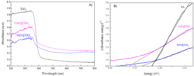 The optical properties of CuO@TiO2 and NiO@TiO2 photocatalysts were investigated by the UV-Vis DRS technique and the plots of Kubelka-Munk function (αhν)1/2 versus energy (hν) were shown in Fig.2A and Fig.2B. From Fig. 2A, the UV-vis-DRS spectra of both CuO@TiO2 and NiO@TiO2 samples are similar to the bare TiO2, showing strong absorption band at 350 nm approximately. In the visible light absorption region, one weak band appeared between 700 and 800 nm, indication that CuO@TiO2 and NiO@TiO2 have a certain ability of absorbing visible light. As seen in Fig. 3B, the band gap energy was estimated to be 3.25 eV for TiO2, 3.19 eV for NiO@TiO2, and 3.11 eV for CuO@TiO2. It is reported that, the addition of Ag, Cu, Pt to TiO2 results in changes in the band gap transition to larger values in wavelength (Grabowska et al., 2013; Kowalska, Remita, Colbeau-Justin, Hupka, & Belloni, 2008). Our results obtained from Fig. 2 demonstrate that encapsulation of TiO2 anatase layer over CuO and NiO phases results in a reduction in the band gap energy of TiO2 in the CuO@TiO2 and NiO@TiO2 core-shell structures with respect to bare TiO2 (Eg=3.25 eV) (Luna et al., 2016).