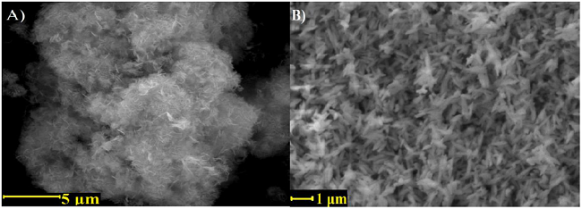 The morphology of pure NiO and CuO oxides was observed by SEM and was shown in Figure 3. SEM images for pure NiO showed many agglomerates of fine nanoparticles forming a dandelion-like structure. A close SEM observation reveals that CuO have nanorod shape with homogeneous morphology and uniform size. The length of the CuO nanorods is approximately 0.5~1.0 μm.