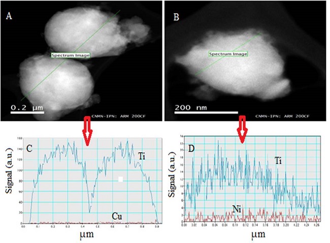 Fig. 4 shows the TEM micrographs of the NiO@TiO2 and CuO@TiO2 photocatalysts. Some larger irregular particles with spherical morphology can be observed in both materials. The diameter of spherical agglomerates calculated from TEM images is about 400~500 nm for both NiO@TiO2 and CuO@TiO2. These agglomerates consist of many small particles with diameter 20-50 nm. The EDS spectra of NiO@TiO2 and CuO@TiO2 samples are shown in Figs.4C and 4D. EDS profile confirmed that Ti element is predominantly distributed in the outer shell of both CuO@TiO2 and NiO@TiO2 samples. TiO2 rough surface is composed of small spherical anatase TiO2 crystals as evidenced by XRD analysis. In both samples, Cu and Ni elements are detectable with very low concentration, indicating that CuO and NiO cores were encapsulated by TiO2 shell. Based on the XRD patterns, EDS analysis, and TEM observation, a schematic representation of CuO@TiO2 and NiO@TiO2 nanostructures is shown in Fig.5.