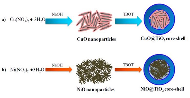CuO nanoparticles (0.125 g) were dispersed in 5 mL absolute ethanol and this suspension was added into a solution consisting of 0.1 g hydroxypropyl cellulose, 20 mL absolute ethanol and 0.125 mL deionized water. This resultant mixture was stirred for 30 min at 600 rpm, and then 1 mL titanium (IV) butoxide (TBOT) in 5 mL absolute ethanol was injected, using a syringe pump, into the above mixture at a rate of 0.5 mL·min-1. This mixture was stirring at 900 rpm and a milk-like gel was obtained. After injection, the temperature of the gel was increased to 85 °C under reflux and agitation condition for 90 min. The precipitate containing CuO@TiO2 solid was centrifuged, washed three times with ethanol and was dispersed in 5 mL absolute ethanol. The coating procedure was repeated three more times in order to increase thickness of TiO2 layer. Finally, the samples were dried and calcined at 400 °C (1 ºC/min) for 3 h in air atmosphere. The same procedure was followed for the preparation of NiO@TiO2 core-shell nanoparticles but using NiO as core.
