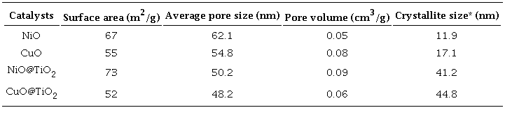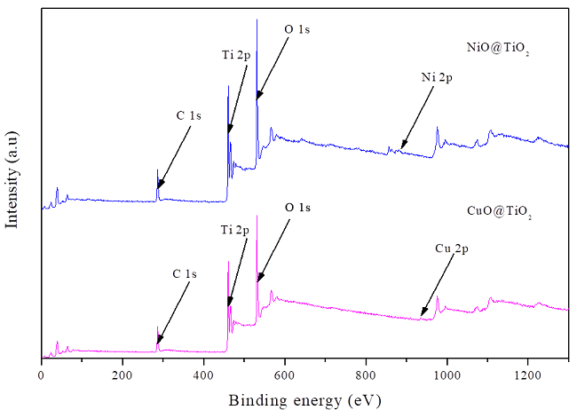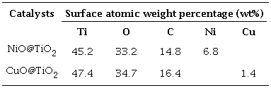 On the basis of XRD and XPS analysis of CuO@TiO2 and NiO@TiO2 catalysts. We may confirm that these two solids are composed of TiO2 shell and an oxide core. In the TiO2 shell layer, there exist some Cu2+ and Cu+ ions in the CuO@TiO2 catalyst and Ni2+ ions in NiO and Ni(OH)2 phase. These results also indicate that Cu2+ ions are partially reduced and some Ni2+ are hydrated to form the nickel hydroxide. However, they are all in a very small amount with size in nanoscale as they are not detectable by XRD analysis. The surface element compositions obtained from XPS analysis of NiO@TiO2 and CuO@TiO2 catalysts are reported in Table 2.