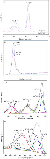 Figure 7 shows the general survey scan XPS spectra of the NiO@TiO2 and for CuO@TiO2 samples. Carbon emission peak observed in the spectra is related to the surface adsorbed carbon dioxide species or trace carbon containing species on the surface of the sample resulting from the sol-gel synthesis procedure (Liu et al., 2014). The core levels of Ti 2p, O1s and Ni 2p signals of the XPS spectra for NiO@TiO2 and Ti 2p, O 1s and Cu 2p for CuO@TiO2 were recorded. The values of binding energy (BE) of Ti 2p spectrum (Fig. 8A) were 458.8 eV (2p3/2) and 464.5 eV (2p1/2) in both NiO@TiO2 and CuO@TiO2. These peaks have been assigned to Ti4+ in the crystalline structure of anatase TiO2 (Liu, Yoshida, Fujita, & Arai, 2014).