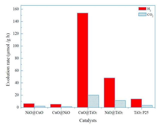 The H2 and CO2 evolution rates achieved on different catalysts are presented in Fig. 9. TiO2 Degussa P25 was also tested as a reference for comparison. When CuO@TiO2 was used as catalyst, the H2 evolution rate (rH2) was as high as 153.8 μmolgcat−1h−1. For NiO@TiO2 catalyst, the H2 evolution rate was 48.1 μmol gcat−1h−1. For the other catalysts, such as TiO2 P25, NiO@CuO, and CuO@NiO, their H2 evolution rate was 13.8, 6.2 and 5.3 μmol gcat−1h−1, respectively. Both CuO@NiO and NiO@CuO catalysts displayed very low photocatalytic activity for H2 production, showing that CuO and NiO were not the active phase. Therefore, nanoparticles consisting of TiO2 shell incorporation with CuO or NiO core dramatically enhanced the rate of H2 production where TiO2 serves as active phase in the control reaction condition. In comparison with results reported by Zhou and Li (2017), the H2 evolution rate obtained over CuO@TiO2 core-shell catalyst in the present work (153.8 μmol·g−1h-1) is greater than the value 131.32 μmol·g−1h-1 obtained from MoS2@TiO2 core-shell catalyst under similar condition. Moreover, the CuO@TiO2 core-shell catalyst is cheaper than MoS2@TiO2, and therefore our catalysts are more attractive.