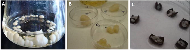 Microorganisms were cultured in a nutrient agar medium and maintained at 4 °C before their use. Fungi T. mentagrophytes was propagated under aseptic conditions in potato dextrose broth (PDB) growth media for 5 to 7 days (Figure 1A). Then, fungi mycelium was removed from the broth for its weighing (Figure 1B) and following deposition (one gram of mycelium) on the leather coated with AgNPs (Figure 1C) to investigate the spreading of fungus on the leather after 20 days of incubation at 37 °C. Thus, T. mentagrophytes susceptibility was determined through the final mycelium weight (after incubation time) on AgNPs-coated leather. A negative control for T. mentagrophytes (leather without treatment) was considered.