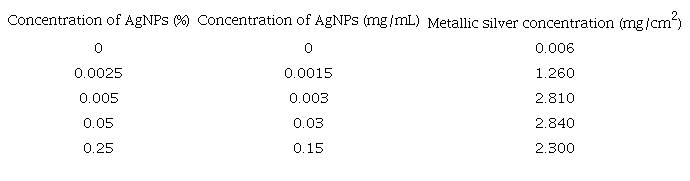 Several dissolutions of Argovit were prepared in distilled water to obtain the following concentrations according with the metallic silver content in each preparation: 0.0025, 0.005, 0.025, 0.05, 0.15 and 0.25%.