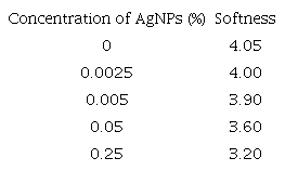 Textural changes on the leather were evaluated, after the application of AgNPs, through a texturometer. The data represent the penetration distance in the leather. Table 2, shows a decrease of leather softness when coated with AgNPs, and it was inversely proportional to the concentration of AgNPs.