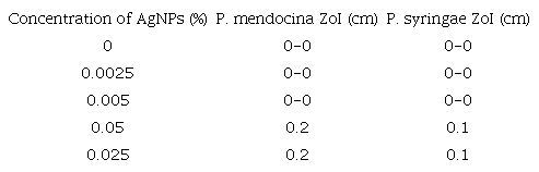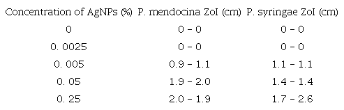 The diameter of the ZoI was also measured for antibacterial activities against P. mendocina and P. syringae bacterium (Table 4). Horizontal and vertical diameters of the ZoI revealed that the inhibition of bacterial growth was evident at 0.05% of metallic silver content; also, a larger inhibition zone was detected when bacteria were exposed to leather coated with 0.25% of metallic AgNPs.