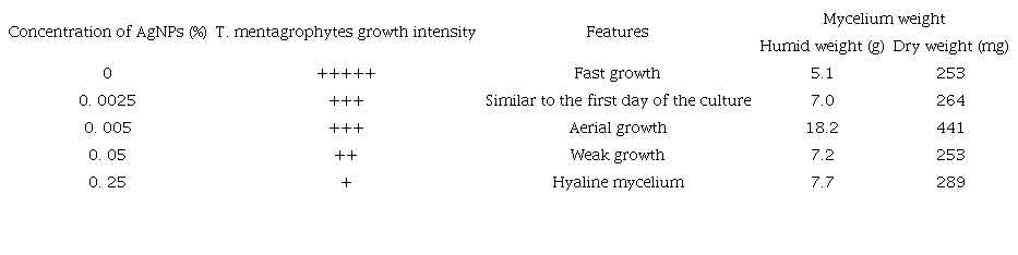 In the case of the antifungal activity of the AgNPs-coated leather against T. mentagrophytes, it was observed that a silver metallic content of 0.5% decreased fungal growth; nevertheless, this amount of metallic silver was did not eliminate fungal growth, as it is shown by mycelium weight (Table 5).