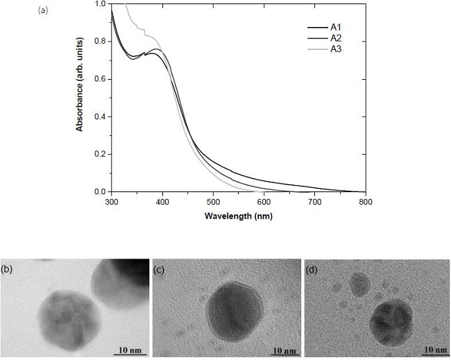 The increase in pH to 13 (A3) reduces the particle diameter to 15 nm. The UV absorption below 400 nm is significantly enhanced but the peak is not clearly observed. The results agree with the pH effect reported by Xiong et al. (2013) that the higher absorbance was observed with increasing pH. The TEM image links this slight blue shift in the UV-vis spectrum to the reduction in particle size. As summarized by Nahar et al. (2020), the pH modifies charges on capping and stabilizing biomolecules during the synthesis which controls the Ag growth and therefore affects the particle size and shape.