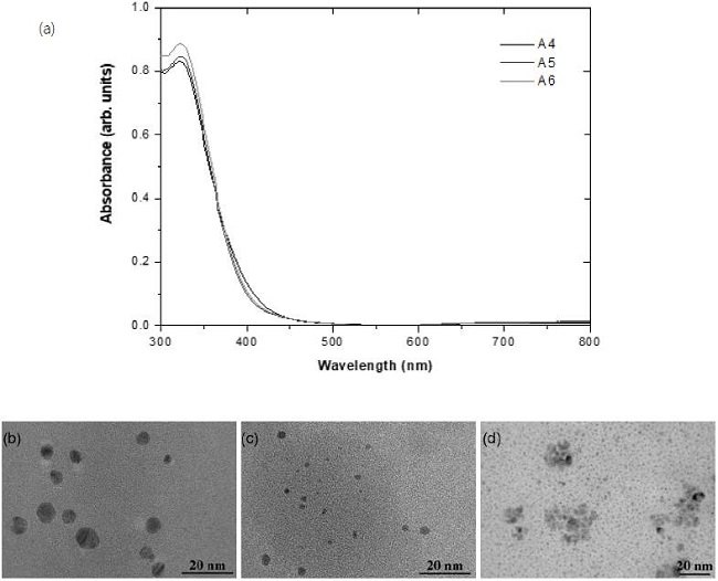 The temperature is less influential than the pH effect. In Fig. 2 (a), the UV-vis spectra in the case of 25 (C, 80 (C, and 90 (C reaction temperatures similarly exhibit the maximum optical absorbance at 330 nm. The shift to a lower wavelength than those in Fig. 1 (a) indicates the reduction in particle size of samples A4-A6. The symmetry of narrow peaks indicates a decrease in morphological distribution. The variation in the peak intensity with the temperature is due to the density of nanoparticles (Dakhil, 2017). The trend is in accordance with TEM images in Figs. 2(b)-(d) showing particles much smaller than 10 nm with a slight increase in density by higher temperature syntheses. Such changes are attributed to the increase in reaction rate with the temperature (Nahar et al., 2020).