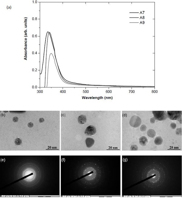 With increasing concentrations of AgNO3, the UV-Vis peak in Fig. 3 (a) is significantly shifted to higher wavelengths. TEM images in Figs. 3(b)-(d) confirm the largest size of nanoparticles from the synthesis using the highest AgNO3 concentration of 0.5 M (A9). Redshifts were previously observed in Ag nanoparticles synthesized with increased AgNO3 concentrations (Baláž et al., 2019; Dragan et al., 2018; Tolouietabar et al., 2020; Xiong et al., 2013). However, the intensity of the peak is substantially reduced suggesting that the nanoparticle concentration is decreased. Other characterization techniques are then used to clarify this discrepancy. In the case of the lowest AgNO3 concentration of 0.1 M (A7), the SAED rings in Fig. 3 (e) are clearly characterized as fcc Ag crystals with the diffraction from (111), (200), (220), (311) lattice planes (Baláž et al., 2019; Saravanan et al., 2017). When the concentration of AgNO3 was increased, the sharpness of the rings in Figs. 3(f)-(g) is reduced which is an indication of mixed phases.