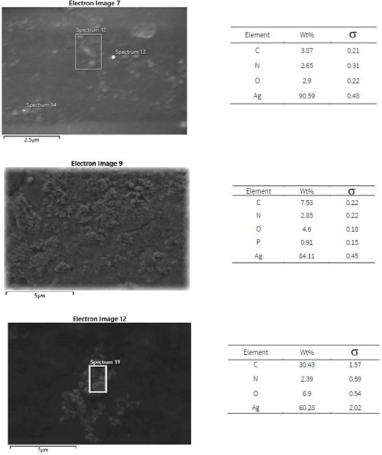 From the SEM micrographs in Fig. 4, the surface of drop-casting nanoparticles is uniform only in the case of the lowest concentration (A7). The EDS confirms the highest composition of Ag over 90%. The Ag composition is respectively reduced to 84% and 60% as the AgNO3 concentration was increased to 0.3 and 0.5 M. The increases in other elements suggest that the reduction is incomplete when excessive AgNO3 concentration is used. The irregular morphology of drop-casting nanoparticles is consistent with the SAED and EDS results.
