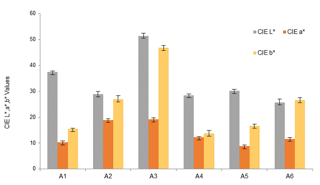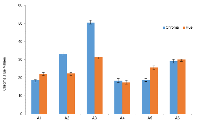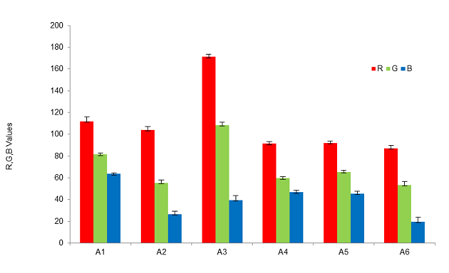 The classification by the RGB color space is complemented by other color parameters. Comparing samples A1-A3, the increase in pH in the synthesis results in substantial rises in the CIE b* value in Fig. 6 and the chroma value in Fig. 7. In addition, sample A3 has the highest CIE L*, hue, and chroma values. Interestingly, the color difference of samples A4-A6 can be clearly detected by using CIE and hue parameters whereas the RGB color space could not distinguish them. The CIE b* value in Fig. 6 and the hue angle in Fig. 7 are significantly increased with increasing synthesis temperature from 25 (C to 90 (C. The RGB color space has mostly been used in smartphone colorimetry (Amirjani & Fatmehsari, 2018; Firdaus, 2019; Sajed et al., 2019) and smaller error bars in Fig. 5 indicate the precision of this method. However, the results from Figs. 6 and 7 strongly suggest that the CIE L*a*b* as well as chroma and hue angle are effective alternatives in the color classification.