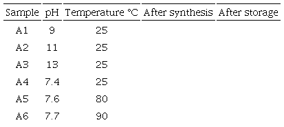 Three synthesis conditions for 9 samples were varied, namely pH, temperature, and AgNO3 concentration. Samples A1, A2, and A3 were prepared using 1 mM AgNO3 at 25 (C with varying pH values of 9, 11, and 13 respectively. The pH was adjusted by adding NaOH and HNO3 solutions. To investigate the temperature effect, samples A4, A5, and A6 were respectively synthesized at 25 (C, 80 (C, and 90 (C with a pH around 7.4-7.7. Finally, the concentration of AgNO3 solution was varied as 0.1, 0.3, and 0.5 M for the samples referred to as A7, A8, and A9 accordingly.