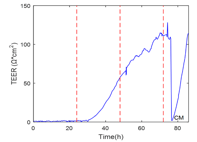 The graph shows an increment in TEER as growth occurred in the cell monolayer, which is the typical behavior reported in the literature. It could be observed that the TEER fell drastically and recovered in about ten hours when the medium was renewed, indicating that the change of medium significantly affected the electrical impedance of the cell monolayer.