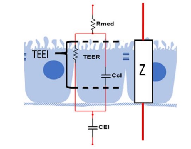 The designed system for transepithelial electrical impedance measurement employs the electrical impedance values obtained by the impedance spectroscopy technique to approximate the electrical parameters of the simple equivalent electrical model of a cellular monolayer, Figure 1. The parallel of the ZTEER will give the resulting electrical impedance value Z (Eq. 1) (due to the transepithelial electrical resistance) and ZCcl (due to the cellular capacitance) in series with the electrical impedance external to the cell monolayer corresponding to the resistance of the medium (Rmed) and the capacitance of the electrode-electrolyte interface (CEI).