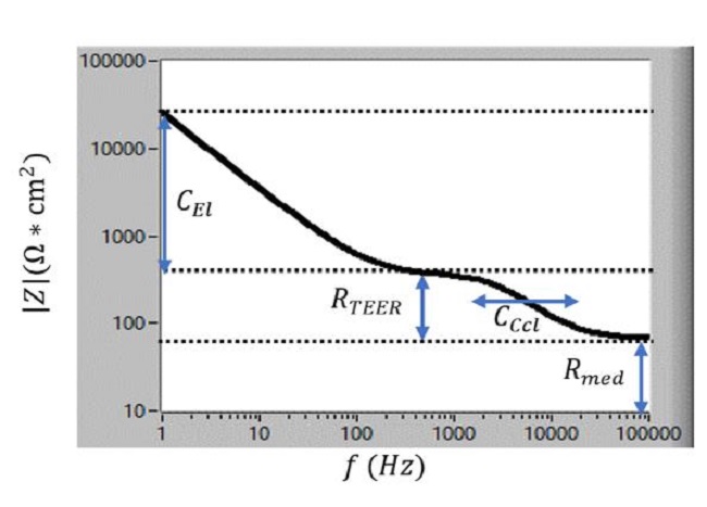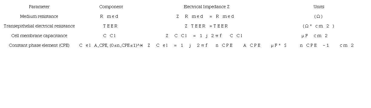 By measuring at different frequencies, the parameters of the equivalent electrical model of the cellular monolayer can be obtained by using both Eq. 2, and the Non-linear least-squares approach method.
