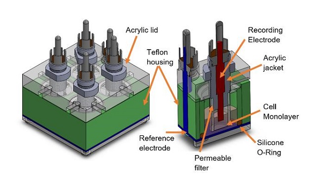 The chamber consisted of four independent wells that house inserts with permeable filters to attach the cell cultures, a stainless-steel plate on the base as a reference electrode, and four recording electrodes on the upper part of the wells immersed in the culture medium on the apical side of the monolayer. Polytetrafluoroethylene (PTFE), also known as Teflon, was chosen for constructing the four-well chamber block because it is a non-polluting and electrical insulator. Besides, the wells were sealed with silicone O-Rings, as shown in Figure 3.
