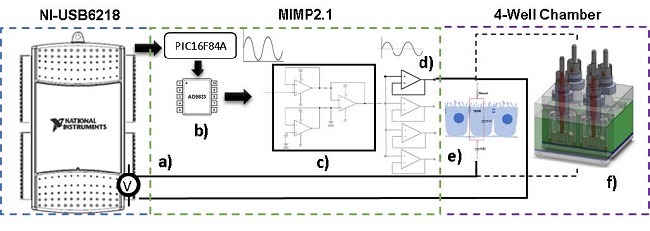 For the voltage measurements in the four wells, a data acquisition card (NI-USB6218) interfaced with the MIMP2.1 was used. Knowing the voltage and the applied current, the electrical impedance was determined by Eq. 3.
