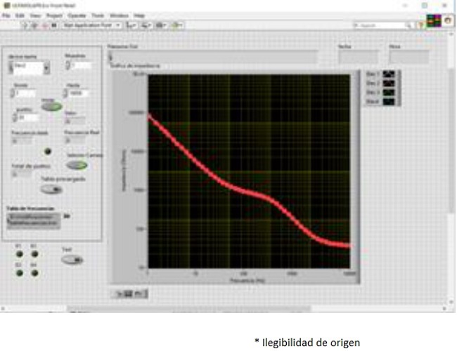 As reported in (Arndt et al., 2004; Lo et al., 1995; Sun et al., 2010; Wegener, 2010), the magnitude of the electrical impedance is presented at each of the frequencies. In this project, the frequency-dependent impedance values are presented graphically in the center area of the front panel for easy reading. In the dialogue area on the left, the parameters to be considered for the measurement are entered. Also in this area there is a button to indicate with green lights the correct contact between the electrode and the culture medium in the four wells.