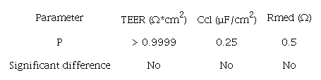 In the same way, the results obtained for the values of TEER and Ccl before and after the magnetic exposure to 50 G @ 60 Hz yielded values of pTEER = 0.3943 in TEER and pCcl = 0.2213 in Ccl in the control cells, and of pTEER = 0.6089 in TEER and pCcl =0.0121 in Ccl in treated cells. The p-values show that no significant differences were observed either, and therefore there were no effects from 50 G exposure.