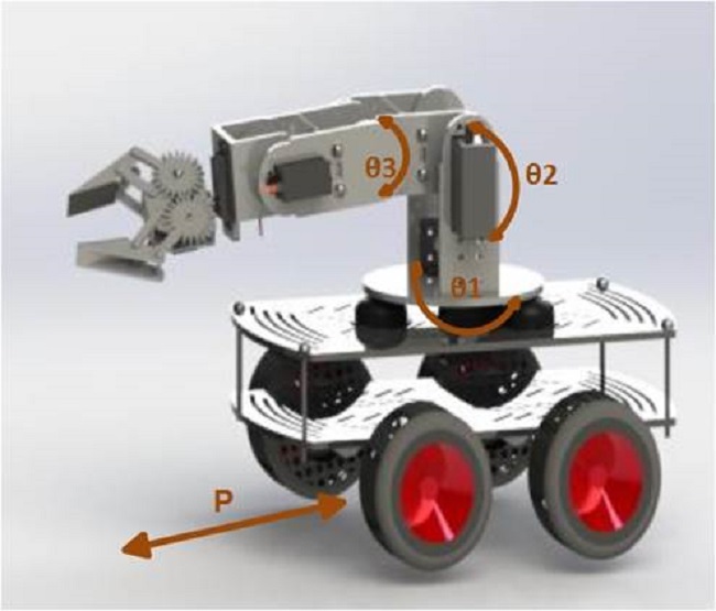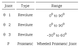 The three revolute joints are termed as θ1, θ2 and θ3 whereas P denotes the prismatic joint. The workspace of the mobile robot arm can be described by the set of points that can be reached by its sprinkler, considering a physically possible mechanical configuration (Patel, 2016). The constraints for each joint are given below in Table 2.
