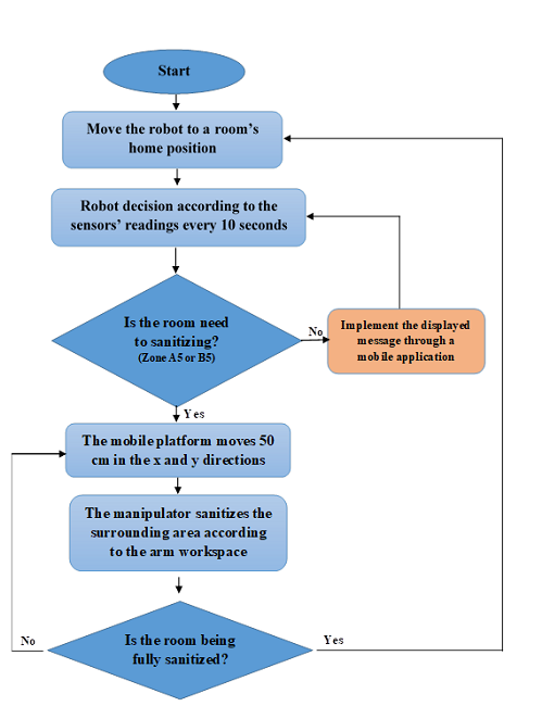 Figure 5 illustrates the movement algorithm of the designed mobile robot. The movement of the mobile platform is based on the odometry method used to move the mobile robot in the x and y directions along a room while the movement of the translation and rotation of the manipulator is based on the inverse kinematics solution to get / (Gaber et al., 2021), which calculates the joint variables that would put the sprinkler in the desired position.