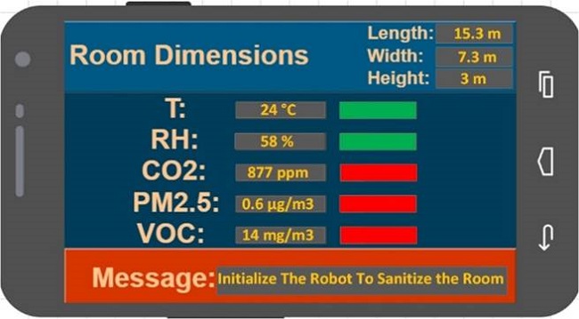 The proposed robot work satisfactory (as designed and programmed) to continuously monitor the major indoor air parameters (temperature, relative humidity, CO2, PM2.5 and VOC) and compare the measured values with pre-set values and take the required action upon deviation. This action is sending a message to the user through a mobile application informing the user of what should be done to restore the ideal air quality conditions. When the required action is sanitization, the mobile application allows a friendly graphical user interface to help the user to start the sanitization function of the robot, thus eliminating the need of cleaning staff and minimize their exposure to possibly infected surfaces.