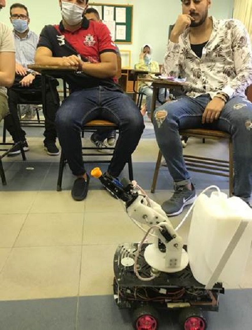 Figure 9 shows one of the practical experiments of the mobile robot arm while sanitizing one of the study halls. The dimensions of the hall are entered by the user as input and the sensors readings are presented to the user from the mobile application as output. In the shown experiment, the situation belongs to zone B5 as shown in Figure 10.